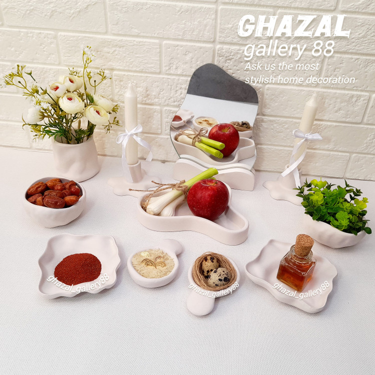 مشخصات کالا دو عدد ظرف تخت دفرمه دو عدد تابه کوچک دوعدد کاسه دفرمه ظرف وسط دفرمه اینه دو عدد شمعدان گلدان دفرمه