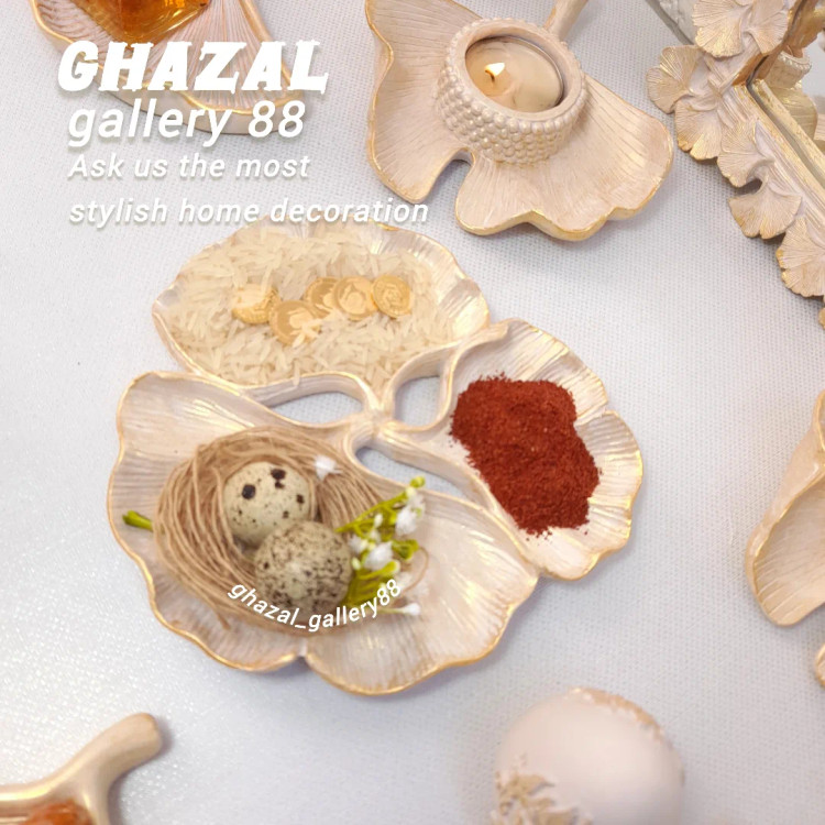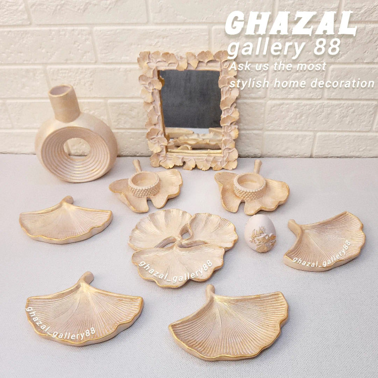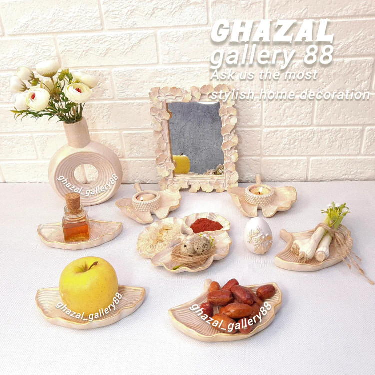 مشخصات کالا: چهار عدد برگ جینگو ظرف وسط سه تایی شمعدان دو عدد اینه مستطیلی تخم مرغ گلدان