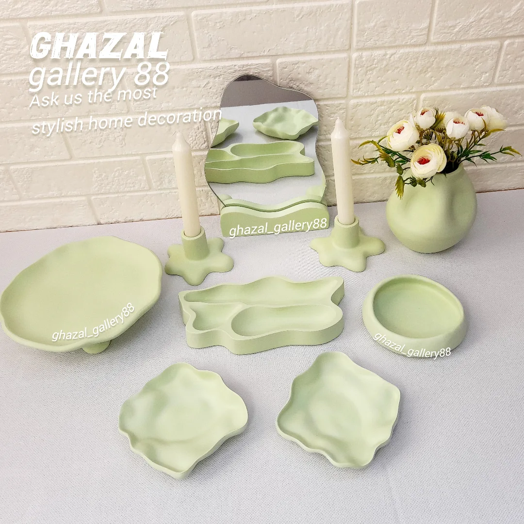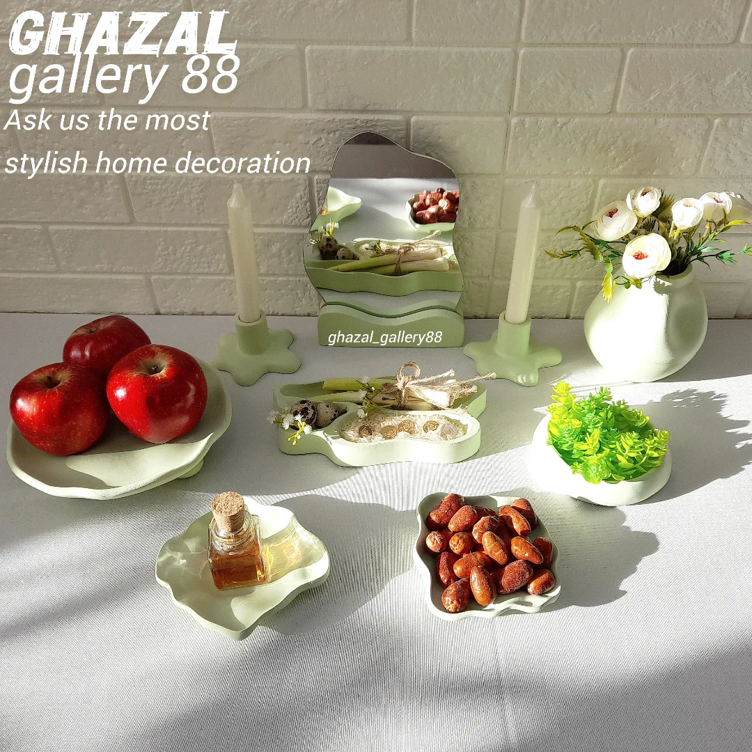 مشخصات کالا ظرف سه پایه سیب دوعدد ظرف دفرمه ظرف سبزه ظرف سه خانه گلدان دفرمه شمعدان دو عدد اینه و پایه اینه ارسال از شهر رشت به شرط سلامت کالا